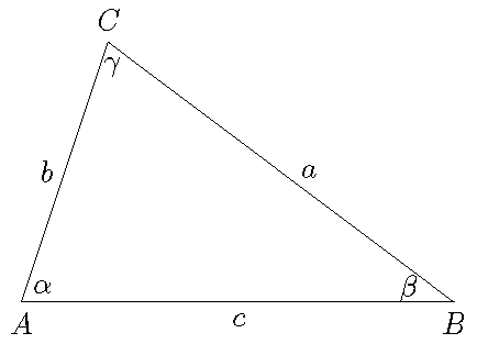 We beschouwen een willekeurige driehoek \(ABC\) met hoekpunten \(A\), \(B\) en \(C\), zijden \(a\), \(b\) en \(c\) en hoeken \(\alpha\), \(\beta\) en \(\gamma\), waarbij \(\alpha+\beta+\gamma=\pi\).