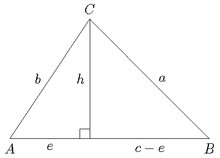 Met behulp van de stelling van Pythagoras vinden we: \(h^2=b^2-e^2\) en \(h^2=a^2-(c-e)^2\). Hieruit volgt dat \(b^2-e^2=a^2-(c-e)^2\) oftewel \(b^2=a^2-c^2+2ce\). Dus geldt: \(e=\displaystyle\frac{b^2+c^2-a^2}{2c}\).
