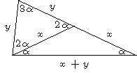 \[\frac{\sin(\alpha)+\sin(\beta)}{\cos(\alpha)+\cos(\beta)}=\tan\left(\frac{\alpha+\beta}{2}\right),\quad\alpha+\beta\ne\pi\;\text{(mod \(2\pi\))}.\]In het plaatje hieronder geldt dat \(\alpha=\frac{1}{7}\pi\). In elk van de drie gelijkbenige driehoeken gebruiken we een rechthoekige driehoek dat de helft ervan is en vinden dat \(\cos(\frac{1}{7}\pi)=\frac{x+y}{2x}\), \(\cos(\frac{2}{7}\pi)=\frac{x}{2y}\) en \(\cos(\frac{3}{7}\pi)=\frac{y}{2(x+y)}\).