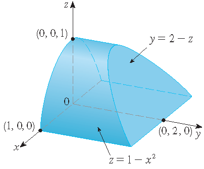 \[E=\{(x,y,z)\,|\,-1\leq x\leq 1,\;0\leq z\leq 1-x^2,\;0\leq y\leq 2-z\}.\]Dus geldt