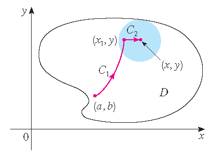 kiezen van \((a,b)\) tot \((x,y)\) om \(f(x,y)\) te berekenen. Omdat \(D\) open is, bestaat er een cirkelschijf in \(D\) met middelpunt \((x,y)\).