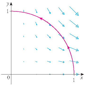 \begin{align*} \int\limits_{\mathcal{C}}\mathbf{F}\cdot d\mathbf{r}&=\int_0^{\frac{1}{2}\pi}\mathbf{F}(\mathbf{r}(t))\cdot\mathbf{r}'(t)\,dt =\int_0^{\frac{1}{2}\pi}\langle \cos^2(t),-\cos(t)\sin(t) \rangle\cdot\langle -\sin(t),\cos(t) \rangle\,dt\\[2.5mm] &=\int_0^{\frac{1}{2}\pi}\left(-2\cos^2(t)\sin(t)\right)\,dt=\frac{2}{3}\cos^3(t)\bigg|_0^{\frac{1}{2}\pi}=-\frac{2}{3}. \end{align*}Opmerking: Het teken van een lijnintegraal van een vectorveld hangt af van de oriëntatie van de kromme: \(\displaystyle\int\limits_{\mathcal{-C}}\mathbf{F}\cdot d\mathbf{r}=-\int\limits_{\mathcal{C}}\mathbf{F}\cdot d\mathbf{r}\).