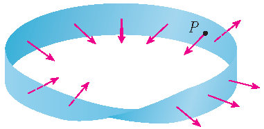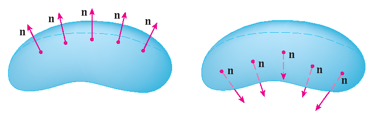Vanaf nu beschouwen we alleen oriënteerbare (tweezijdige) oppervlakken. Zo mogelijk kiezen we een eenheidsnormaalvector \(\mathbf{n}\) in elk punt \((x,y,z)\) op zo'n oppervlak zodat \(\mathbf{n}\) continu varieert over \(S\), dan heet \(S\) een georiënteerd oppervlak en de bepaalde keuze van \(\mathbf{n}\) voorziet \(S\) van een oriëtatie. Er zijn twee mogelijke oriëntaties voor elk oriënteerbaar oppervlak:
