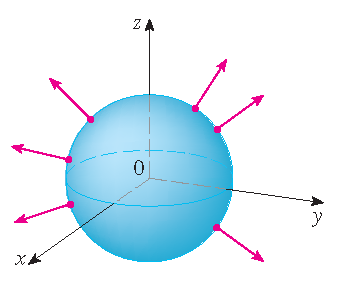 Voor een gesloten oppervlak, dat wil zeggen, een oppervlak dat de rand is van een lichaam \(E\), is de conventie dat de positieve oriëntatie degene is waarvan de normaalvectoren naar buiten wijzen vanuit \(E\) en de naar binnen wijzende normalen geven de negatieve oriëntatie.