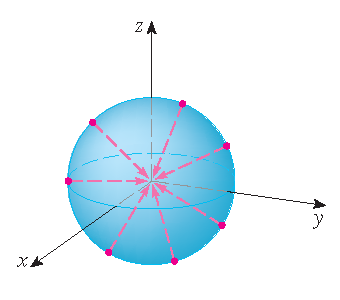 \[\mathbf{r}(\phi,\theta)=a\,\sin(\phi)\,\cos(\theta)\,\mathbf{i}+a\,\sin(\phi)\,\sin(\theta)\,\mathbf{j}+a\,\cos(\phi)\,\mathbf{k}\]met domein \(0\leq\phi\leq\pi\) en \(0\leq\theta\leq2\pi\) een parametervoorstelling is voor de bol \(x^2+y^2+z^2=a^2\) met \(a\geq0\). Dan geldt