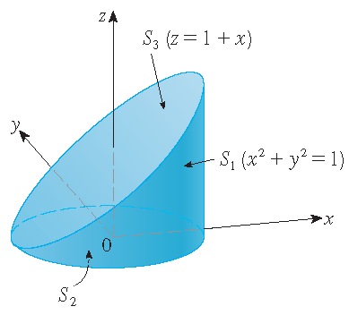 Het bovenste oppervlak \(S_3\) ligt boven de eenheidscirkelschijf \(x^2+y^2\leq 1\) en is deel van het vlak \(z=1+x\) dat de grafiek is van een functie van twee variabelen: