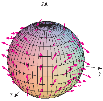 \[\mathbf{r}(\phi,\theta)=\sin(\phi)\,\cos(\theta)\,\mathbf{i}+\sin(\phi)\,\sin(\theta)\,\mathbf{j}+\cos(\phi)\,\mathbf{k},\quad 0\leq\phi\leq\pi,\quad 0\leq\theta\leq 2\pi.\]Dan geldt als eerder