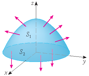 \[\mathbf{r}(x,y)=x\,\mathbf{i}+y\,\mathbf{j}+0\,\mathbf{k},\quad x^2+y^2\leq 1\]met \(\mathbf{r}_x\times\mathbf{r}_y=\langle 1,0,0\rangle\times\langle 0,1,0\rangle=\langle 0,0,1\rangle\), die naar boven gericht is. De positieve (naar buiten gerichte) oriëntatie zou naar beneden gericht moeten zijn op \(S_2\), dus volgt