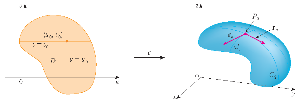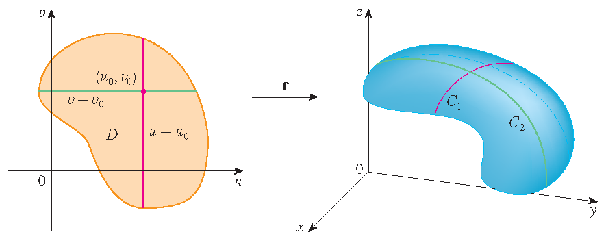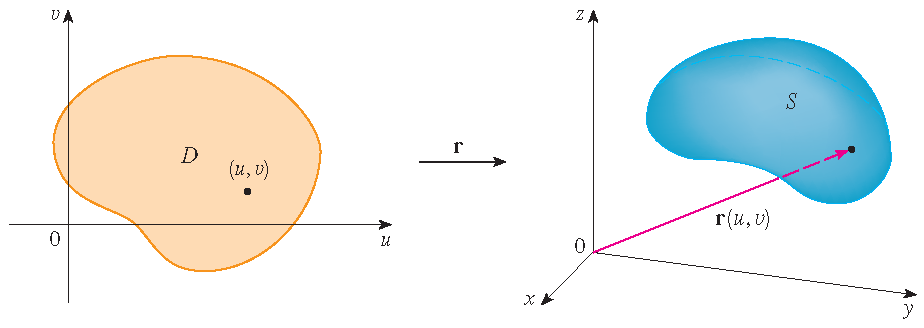\[\mathbf{r}(u,v)=x(u,v)\,\mathbf{i}+y(u,v)\,\mathbf{j}+z(u,v)\,\mathbf{k},\quad (u,v)\in D.\]