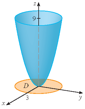 Oplossing: Het vlak \(z=9\) snijdt de paraboloïde in de cirkel \(x^2+y^2=9\). Het gegeven oppervlak ligt dus boven de cirkelschijf \(D\) met middelpunt de oorsprong en straal \(3\). Een parametrisering van het oppervlak is