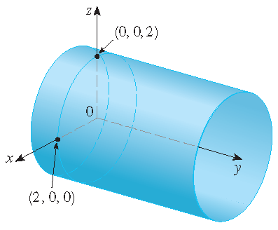 Oplossing: In cilindercoördinten heeft de cilinder de eenvoudige representatie \(r=2\). Als we dan de parameters \(\theta\) en \(z\) in cilindercoördinaten kiezen, dan volgt: