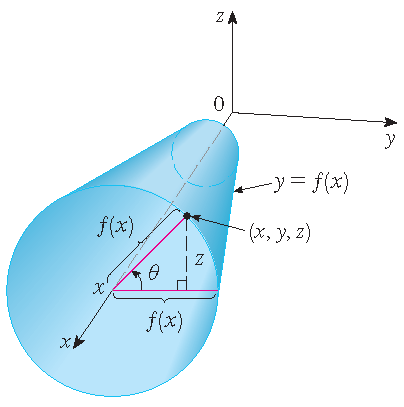 \[S:\;\mathbf{r}(x,\theta)=x\,\mathbf{i}+f(x)\cos(\theta)\,\mathbf{j}+f(x)\sin(\theta)\,\mathbf{k},\quad a\leq x\leq b,\quad 0\leq\theta\leq2\pi.\]Zie het plaatje rechts.