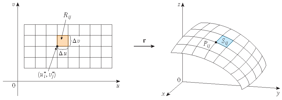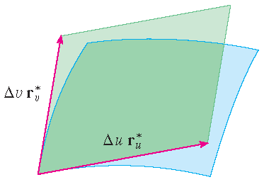 \[\left|\left(\Delta u\,\mathbf{r}_u^*\right)\times\left(\Delta v\,\mathbf{r}_v^*\right)\right| =\left|\mathbf{r}_u^*\times\mathbf{r}_v^*\right|\,\Delta u\,\Delta v.\]Een benadering van de oppervlakte van \(S\) is dus