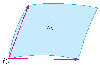 Het plaatje laat zien dat de twee randen van de patch die in \(P_{ij}\) bij elkaar komen kunnen worden benaderd door vectoren. Deze vectoren, op hun beurt, kunnen worden benaderd door de vectoren \(\Delta u\,\mathbf{R}_u^*\) en \(\Delta v\,\mathbf{r}_v^*\) omdat partiële afgeleiden kunnen worden benaderd door differentiequotiënten. We benaderen zo dus \(S_{ij}\) door het parallellogram opgespannen door de vectoren \(\Delta u\,\mathbf{r}_u^*\) en \(\Delta v\,\mathbf{r}_v^*\). Dit parallellogram wordt getoond in het plaatje en ligt in het raakvlak aan \(S\) in \(P_{ij}\). De oppervlakte van dit parallellogram is