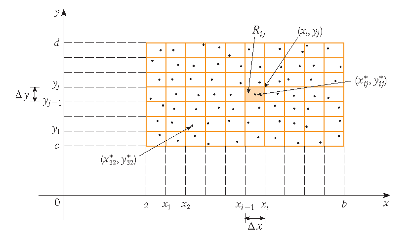 \[\iint\limits_Rf(x,y)\,dA=\lim\limits_{m\to\infty}\lim\limits_{n\to\infty}\sum_{i=1}^m\sum_{j=1}^nf(x_{ij}^*,y_{ij}^*)\Delta A.\]